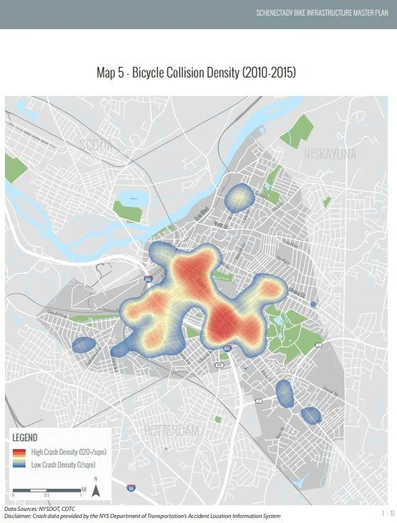 What if we were to consider converting segments of high-traffic streets like Erie Boulevard into multi-modal boulevards, consistent with the 2017 “Bike Schenectady” Bike Infrastructure Master Plan, as reflected below?